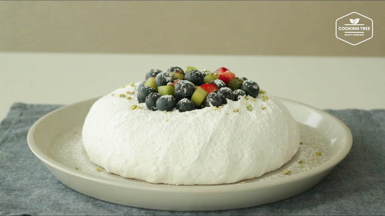 – 100g Blanc d'oeuf – 150 g) sucre – 6g de fécule de maï – 5g de jus de citron – 3g d'extrait de vanille – Crème fouettée – Purée de myrtille – Myrtille – Kiwi – Fraise – Pistache – Sucre en poudre
