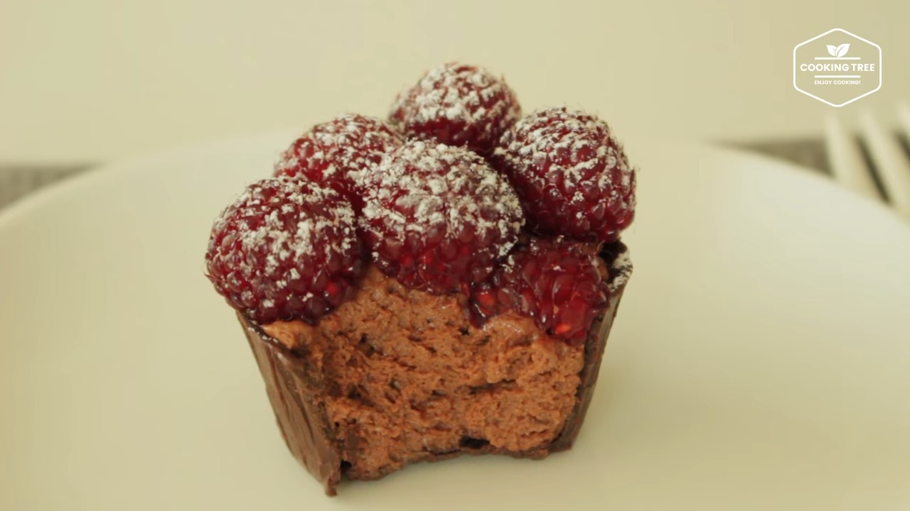 5. Mettre la mousse au chocolat dans une tasse en chocolat et faire durcir au congélateur pendant 30 minutes, puis déposer les framboises dessus et décorer de sucre en poudre.
