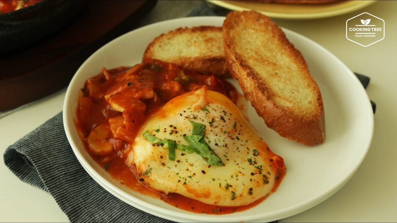 – 2 Champignon – 1/4 oignon – 1/4 paprika – 3 à 4 lignes de Bacon – Huile d'olive – 1/2T d'ail haché – poivre – Pepéroncino – 250g Sauce tomate – 100 ml d'eau – 50g de Mozzarella – 3 oeuf – Basilic ou persil
